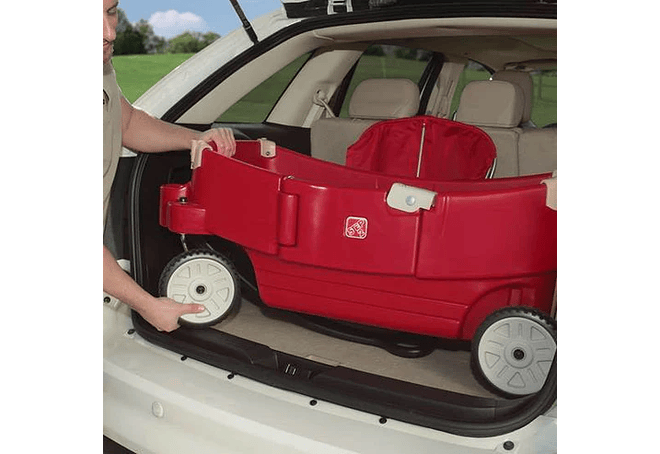 Este carro de arrastre de la marca norte americana Step2 es muy silencioso en su andar y viene con dos asientos finamente modelados para máxima comodidad de los niños.