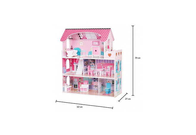La casa cuenta con un colorido diseño y con tres diferentes niveles el cual el tercer nivel cuenta con una terraza para el aire libre donde las niñas dejaran llevar su imaginación y creatividad, con espacio suficiente para que puedan jugar varias niñas a la vez.