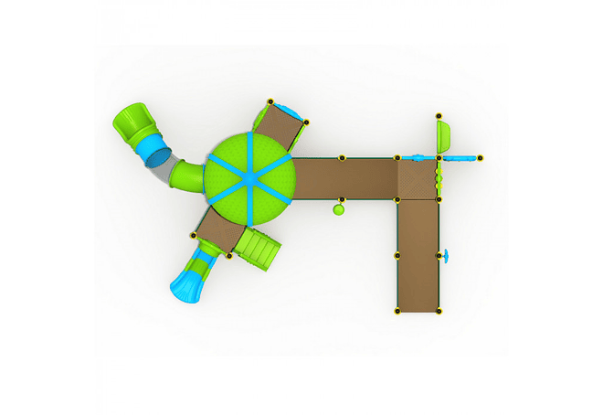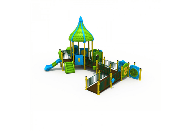 Juego modular de alto tráfico para plazas públicas, condominios, centros de recreación, casas de cumpleaños y muchas opciones más. Este modelo combina la entretención y la inclusión en un solo juego, adaptándose para todos los pequeños que quieran divertirse. Este hecho con plataformas al nivel del piso para facilitar el acceso e incluye juegos y paneles interactivos a una baja altura.