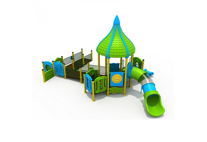 Incluye 1 tobogán techado, 1 resbalín, 1 escalera de acceso, 1 juego de gato y 6 paneles interactivos.